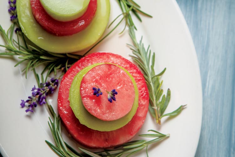 The concept for Melon Cakes with Rosemary Lavender Syrup originates from the stunning array of melon shape options. There is so much melon at once that we have the luxury of playing with our food. The discarded shapes are as delicious as they are geometrically pleasing. Still, these festive little melon cakes are worth the carving and shaping effort. They present as easily as a dessert as they do a salad course (without the herb syrup, of course). It depends on how sweet you want them to be. I have drizzled them with vinaigrette in a circle of greens with beefsteak tomato slices in between, and also served them with a sorbet layer at the meal’s end. Both approaches are showstoppers.