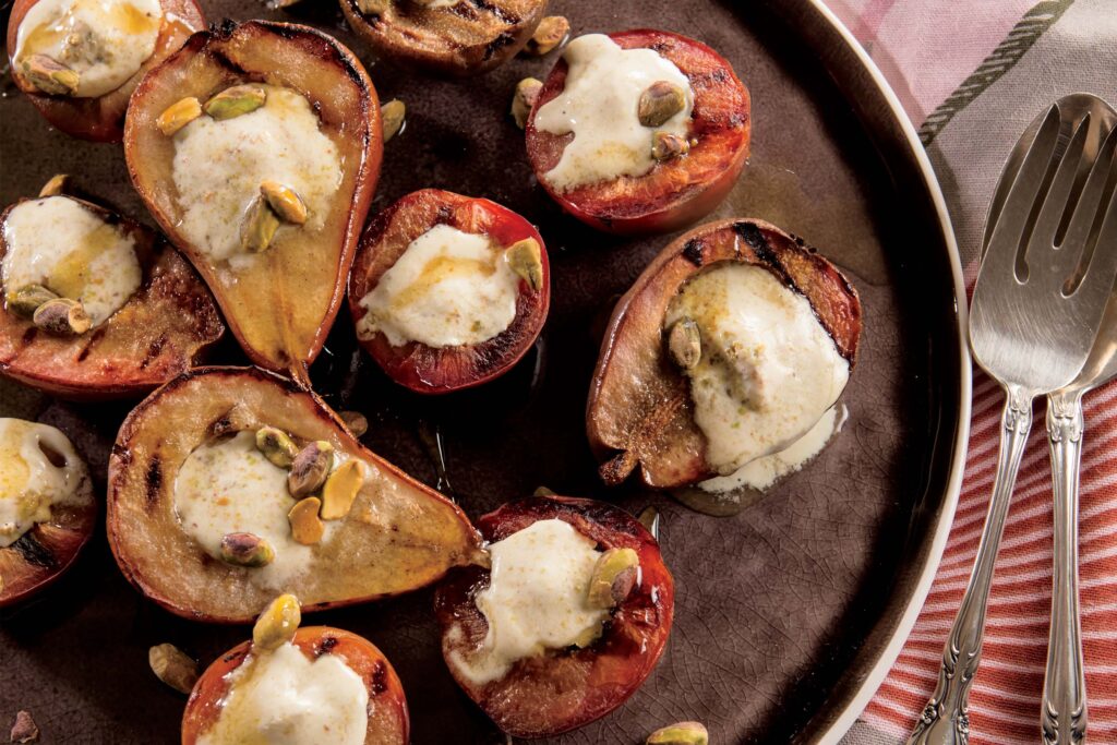 Grilled Plums and Pears with Sorghum-Pistachio Creme