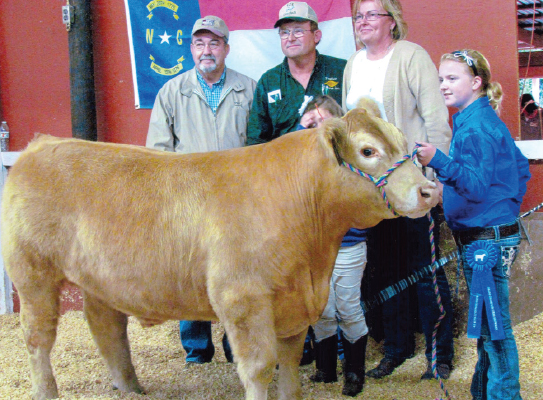 Madison Boyd, the daughter of BEAUFORT COUNTY Farm Bureau members Larry G. and Sandra L. Boyd of Pinetown, exhibited the Grand Champion Steer at the Beaufort County- Washington County Livestock Show and Sale May 1. Madison was also named the Grand Champion Junior Steer Showman. Beaufort County Farm Bureau was among the buyers of the Grand Champion Steer. Pictured, left to right, are Beaufort County Farm Bureau President Mac Daniels, Larry G. Boyd of Foxfire Farms, Inc., Alva McCall of McCall’s Construction, McCall’s granddaughter Paige Smith and Madison Boyd, with Tater.