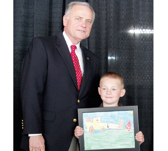 Ashton Brown, pictured at right, son of ROWAN COUNTY Farm Bureau members Dodd and Kelly Brown, had his artwork selected to appear in the new NC Farm to School calendar. Ashton attends Rockwell Elementary School and his entry was one of 13 chosen from 3,854 entries from across the state. Ashton is pictured with North Carolina Department of Agriculture & Consumer Services Chief Deputy Commissioner David Smith.