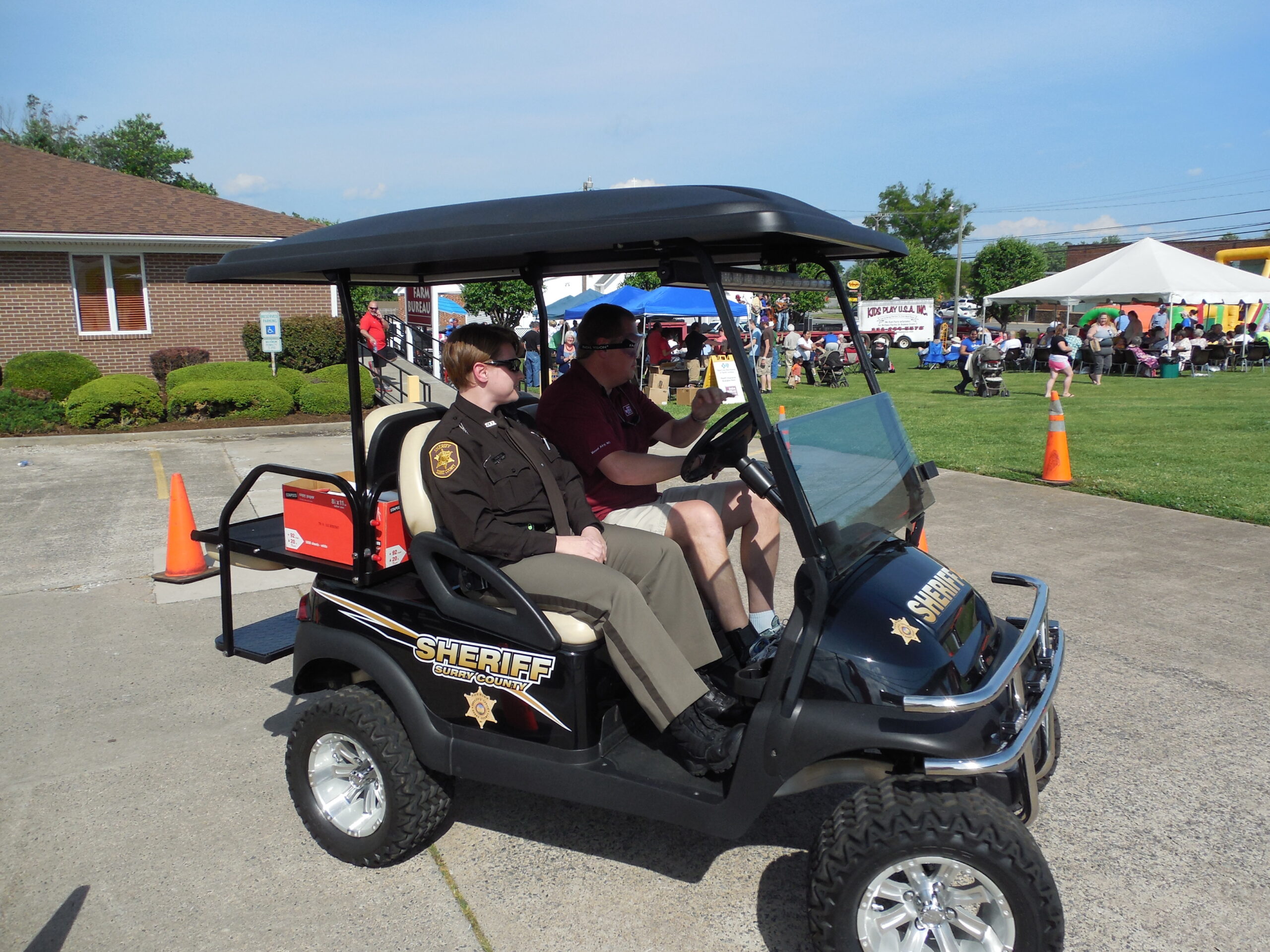 Surry County Farm Bureau donated $6,700 to the Surry County Sheriff’s Department to be used to purchase a trailer to be used in their Impaired Driving Prevention program. The trailer will haul a golf cart and special goggles to be used to demonstrate the effects of driving while impaired. The program is taken to schools and used at area events. It was used at our Member Appreciation Day, May 22, 2014.