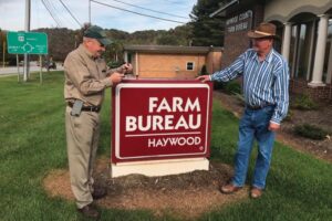 Don Smart, president of the Haywood County Farm Bureau, presented Bill Yarborough with a custom-made, engraved pocketknife on behalf of the county Farm Bureau to honor Yarborough for his many years of service to agriculture. Yarborough recently retired from the North Carolina Department of Agriculture & Consumer Services (NCDA&CS). He most recently held the position of special assistant to NCDA&CS Commissioner Steve Troxler and previously served as a regional agronomist. Yarborough has always been a strong advocate for agriculture both on and off the job, and he still serves many volunteer roles to support the industry. Yarborough may be retired, but he continues to be a friend to and a trusted resource for farmers.
