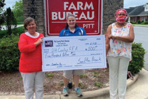 Shelley Armour, FFA advisor at D.H. Conley High School, was presented a check for $500 from Pitt County Farm Bureau President Sue Ellen Brock and Women’s Committee Chairwoman Madelyn Jones. The donation will be used in the school’s Ag in Our Own Backyard Project.