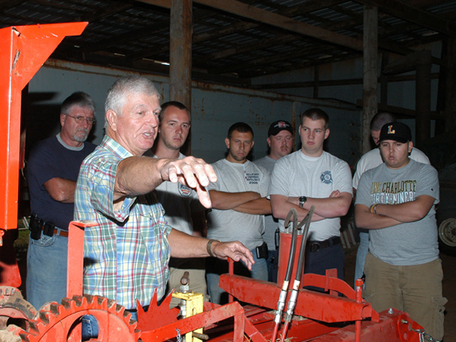 LINCOLN COUNTY Farm Bureau President Jerry Wyant, front, talks to a group of firefighters who attended a farm safety program at his farm about the potential for danger when using the knotter on a hay baler.