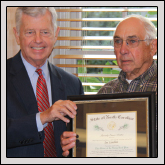 TYRRELL COUNTY Farm Bureau board member Joe Landino, right, was presented with the Order of the Long Leaf Pine by Norris Tolson, NC Biotechnology Center President and CEO, Dec. 20 at the Eastern NC 4-H Center in Columbia.