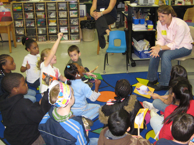 Bethany Pugh takes questions from kindergartners at Mattamuskeet Elementary School in Hyde County.