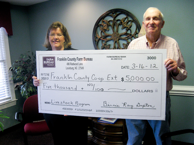 FRANKLIN COUNTY Farm Bureau recently made a number of notable donations. It donated $5,000 to Franklin County Cooperative Extension to support the livestock program and $5,000 to Franklin County 4-H to support their local 4-H programs. In addition, Franklin County Farm Bureau presented $1,500 to each of the county’s three FFA programs, at Franklinton High School, Louisburg High School and Bunn High School.