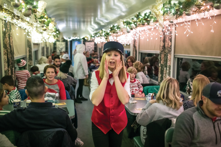 Pajama-clad families board the Polar Express and embark on a trip to the North Pole, with hot chocolate and cookies served on board the train. The experience is set to the music of The Polar Express movie soundtrack, and passengers sing, dance and listen to a reading of the companion story. Santa makes an appearance at the North Pole and passengers receive a souvenir silver bell on the ride back to the museum.